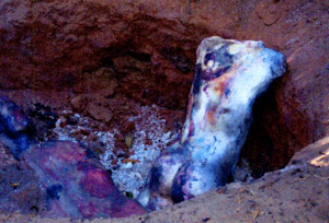 Pit fire is where you dig a hole in the ground and get these beautiful colors using arcane combinations of ingredients such as seaweed, exotic sawdust and cow dung. Bisked (prefired ceramic) pieces are placed for 24 hours to bake in the coals. At the end, after a sleepless night filled with hopeful expectation and waiting, comes the cherished moment to gently dig through the ash and burnt embers to see what treasures or trash may result. With good fortune maybe half the pieces will come out beautifully. For many others the colors are just blaahhhh! or the pieces have been fractured by the shocking forces required.